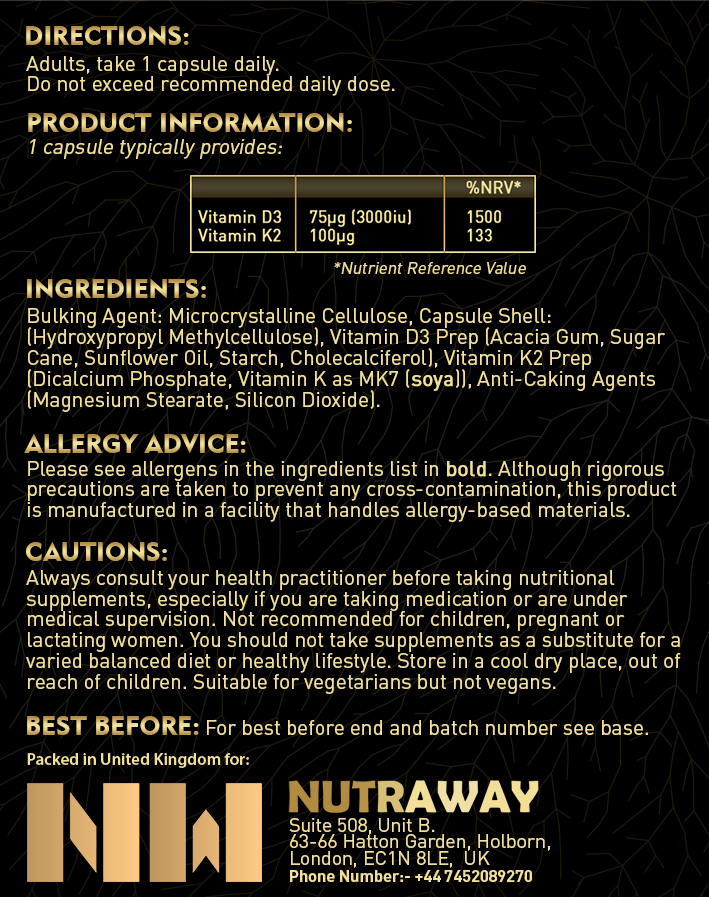 Each capsule contains a blend of Vitamin D3 3000iu and Vitamin K2 100ug MK7